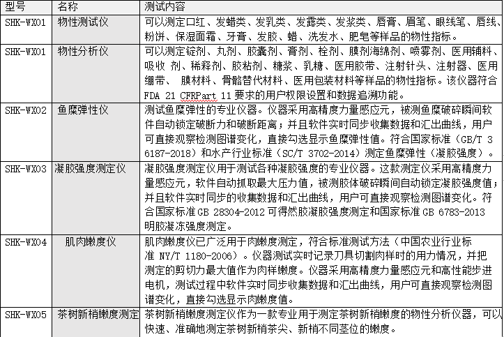 SHK-WX03凝膠強度測定儀用于測試各種凝膠強度的專業(yè)儀器。這款測定儀采用高精度力量感應(yīng)元,軟件自動抓取最大壓力值,被測膠體破碎瞬間自動鎖定凝膠強度值并且軟件實時同步的收集數(shù)據(jù)和匯出曲線,用戶可直接觀察檢測圖譜變化。符合國家標(biāo)準(zhǔn)GB 28304-2012可得然膠凝膠強度測定和國家標(biāo)準(zhǔn)GB 6783-2013明膠凝凍強度測定。 功能 該款儀器可用于測試果醬、果凍、明膠、可得然膠、蛋白、卡拉膠、魔芋膠、瓊脂、瓊膠、硅膠、樹脂、水凝膠、黃油、奶油、